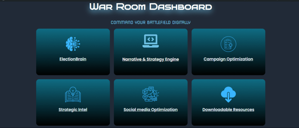 War Room Dashboard: हे तुमचं AI Powered Command Hub आहे – जिथे प्रत्येक निर्णय आणि रणनीतीला AI च्या Super Power ची जोड मिळते. एक असं Action Center जे तुमच्या प्रचार मोहिमेची धार 100X वाढवण्यास मदत करतं. ज्यामध्ये खालील शक्तिशाली फीचर्स आहेत: